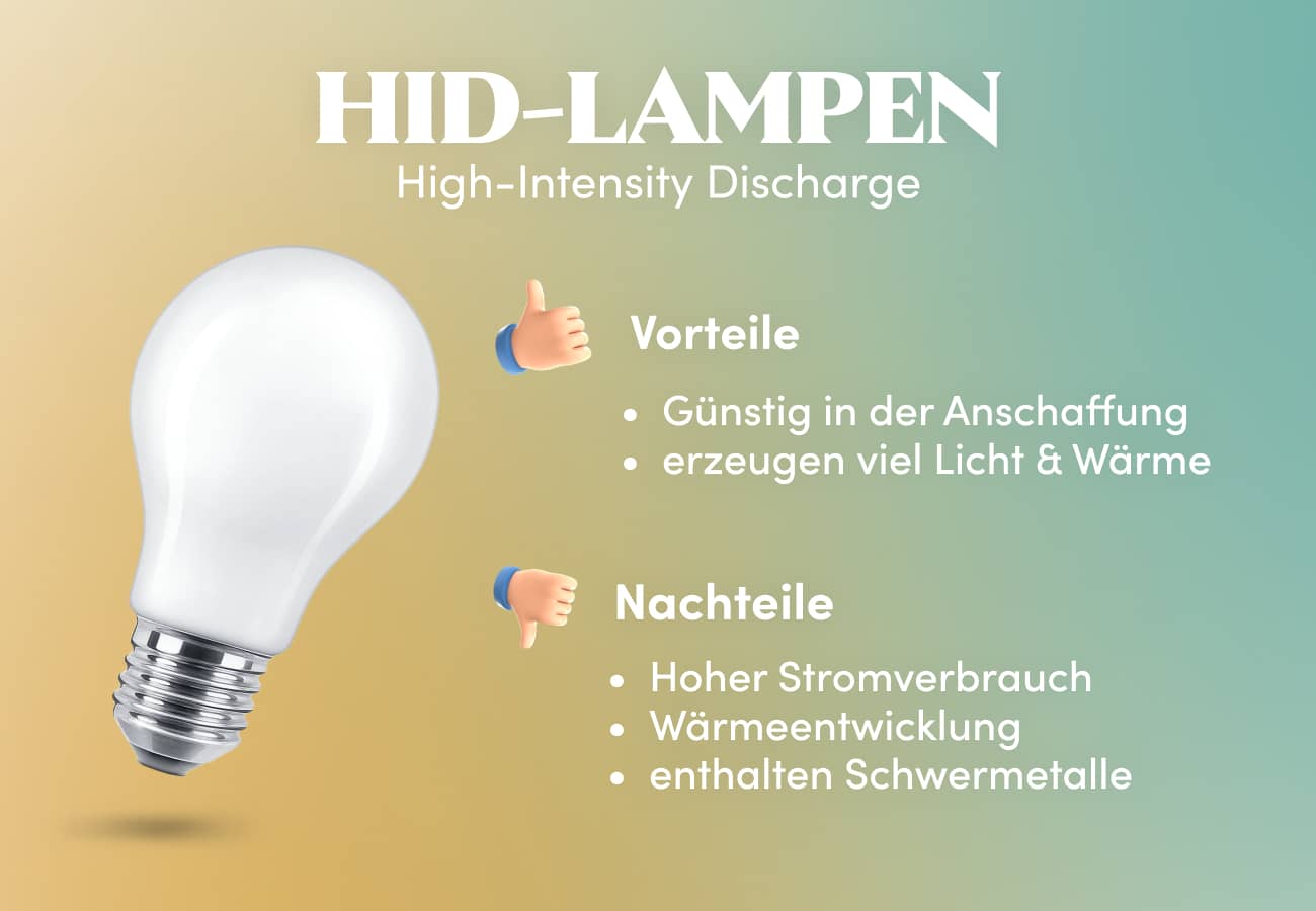 HID (High-Intensity Discharge) ist ein Oberbegriff für leistungsstarke Beleuchtungssysteme, unter denen MH- und HPS-Lampen fallen. Dieser Lampentyp verfügt typischerweise über eine Haube, die das Licht reflektiert. Im Gegensatz zu den Glühbirnen bei dir zu Hause, die einen Glühfaden enthalten, der erwärmt wird, handelt es sich bei HID-Lampen um geschlossene Kapseln, die ein Gas enthalten.