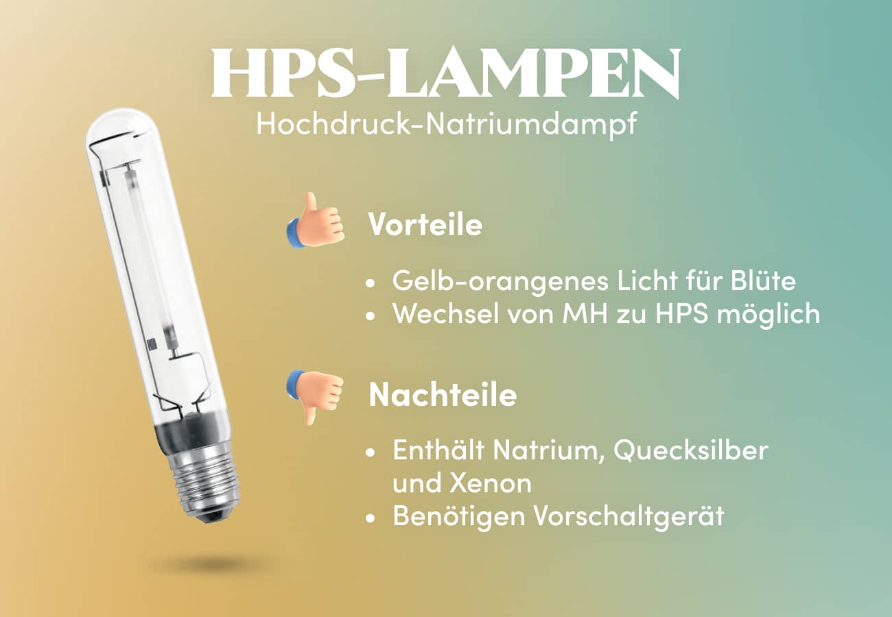 Diese HID-Lampen enthalten in der Regel Natrium, Quecksilber und Xenon und erzeugen ein gelb-orangefarbenes Licht, das häufig für blühende Pflanzen verwendet wird. Einige Züchter beginnen ihre Pflanzen mit MH-Lampen und wechseln zu HPS, wenn die Pflanzen in die Blütephase eintreten, wobei sie dieselbe Haube verwenden. Diese Lampen benötigen ebenfalls ein Vorschaltgerät.