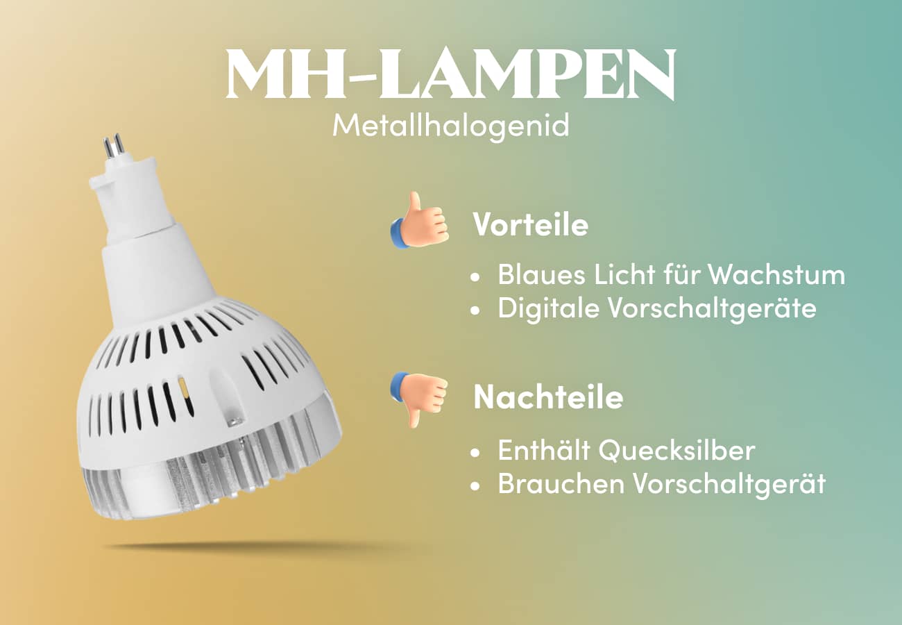 Diese Lampen enthalten Quecksilber und Metallhalogenide, erzeugen ein bläuliches Licht und werden in der Regel für das vegetative Wachstum verwendet. Sie benötigen ein Vorschaltgerät, um den Strom zu regulieren. In der Vergangenheit waren die Vorschaltgeräte groß und sperrig, aber jetzt gibt es auch digitale Vorschaltgeräte.